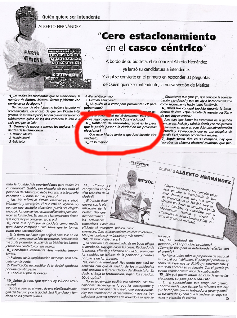 matices-1resaltadoEstando en campaña en 2011, como precandidato a intendente, la excelente revista Matices, me hizo una nota y entre otras cosas me preguntó sobre lo peor que podía pasarle a Córdoba. Mi respuesta fue: “ Que gane Mestre o que Juez invente otro candidato”.