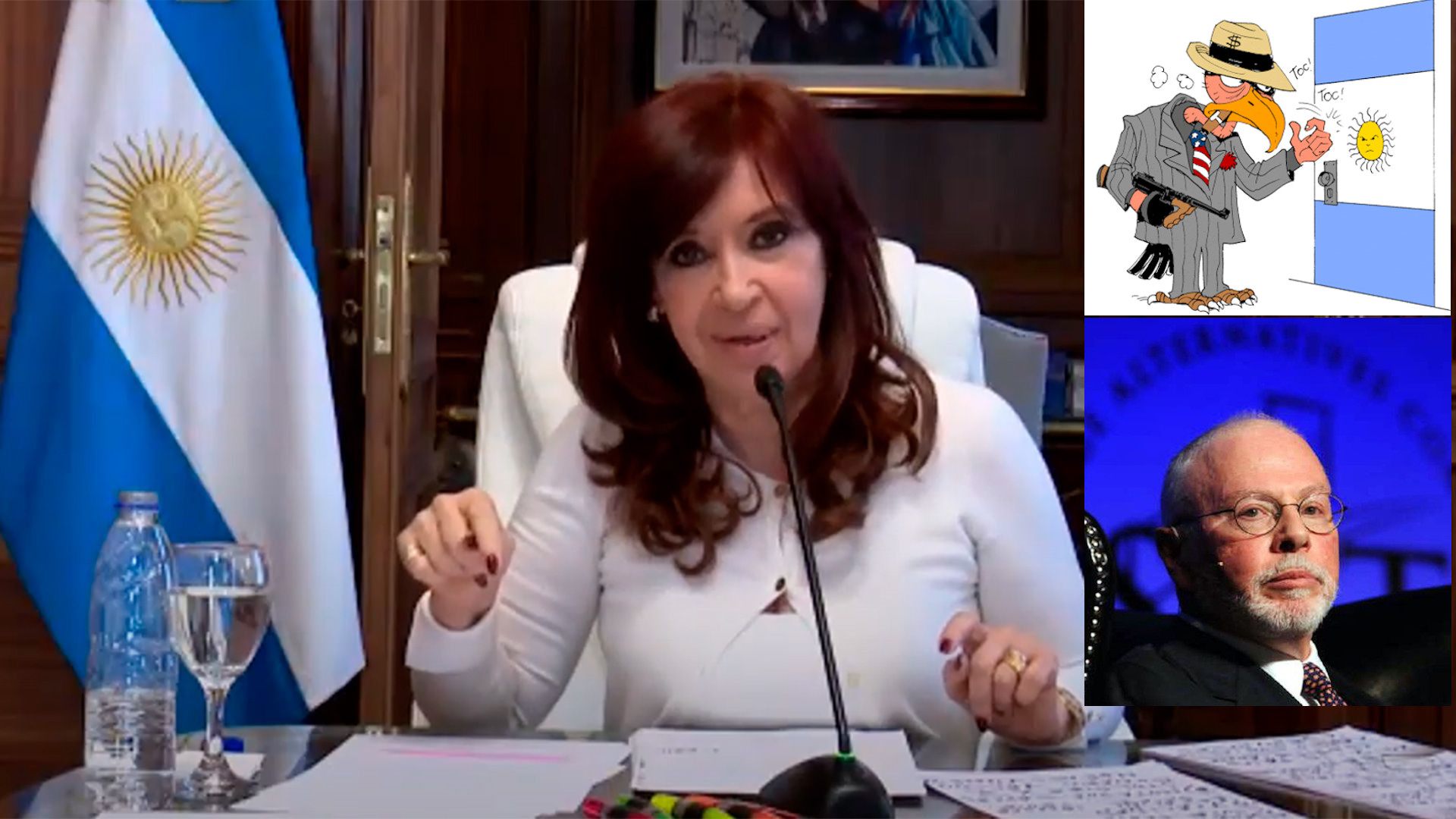 parte de su alegato: «En los años que me tocó ser presidenta nos habían declarado la guerra los buitres que querían cobrar de la Argentina, decían que había que pagar porque después iba a venir mucha inversión» y expuso las solicitadas aparecidas en los principales diarios europeos, sobre un supuesto pacto entre su gobierno y el de Irán, solicitadas que afirmó fueron pagadas por la Task Force Argentina” que fue “un grupo de choque de los fondos buitres” y enfatizó que «Quisieron doblarme la mano por años para pagarles cualquier cosa, y me negué (…) Me banqué lo que me banqué y no me doblaron el brazo. Era condenar a la Argentina a un endeudamiento monumental. Queríamos desendeudar al país, era la única forma de crecer (…) el Memorándum, lo de Vialidad, lo de dólar futuro, está armado para denostarnos a nosotros y para que el pueblo argentino se entregue débilmente a lo que siempre hicieron desde afuera, dominarnos a través de la deuda. Esto pasó en la República Argentina».